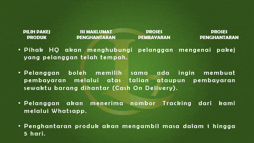 Kami menyediakan COD iaitu bayar ketika barang sampai melalui NinjaVan, Walk-In di pejabat pengurusan HQ dan bayaran secara atas talian (Online Banking).